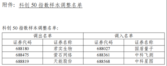 日前,上交所和中证指数有限公司联合发布公告称,宣布调整科创50等指数样本,调整于3月13日收市后正式生效。本次科创50指数共更换3只样本,君实生物与萤石网络、天能股份一同被调出,国盾量子、中科飞测、中科星图新晋入选。